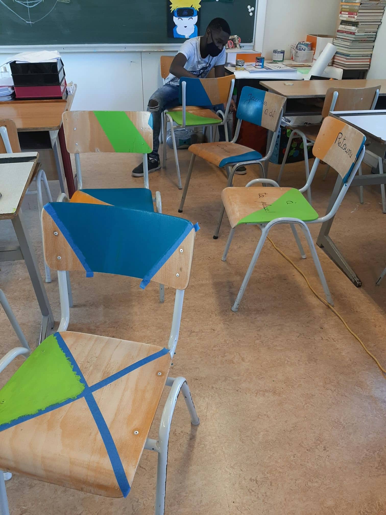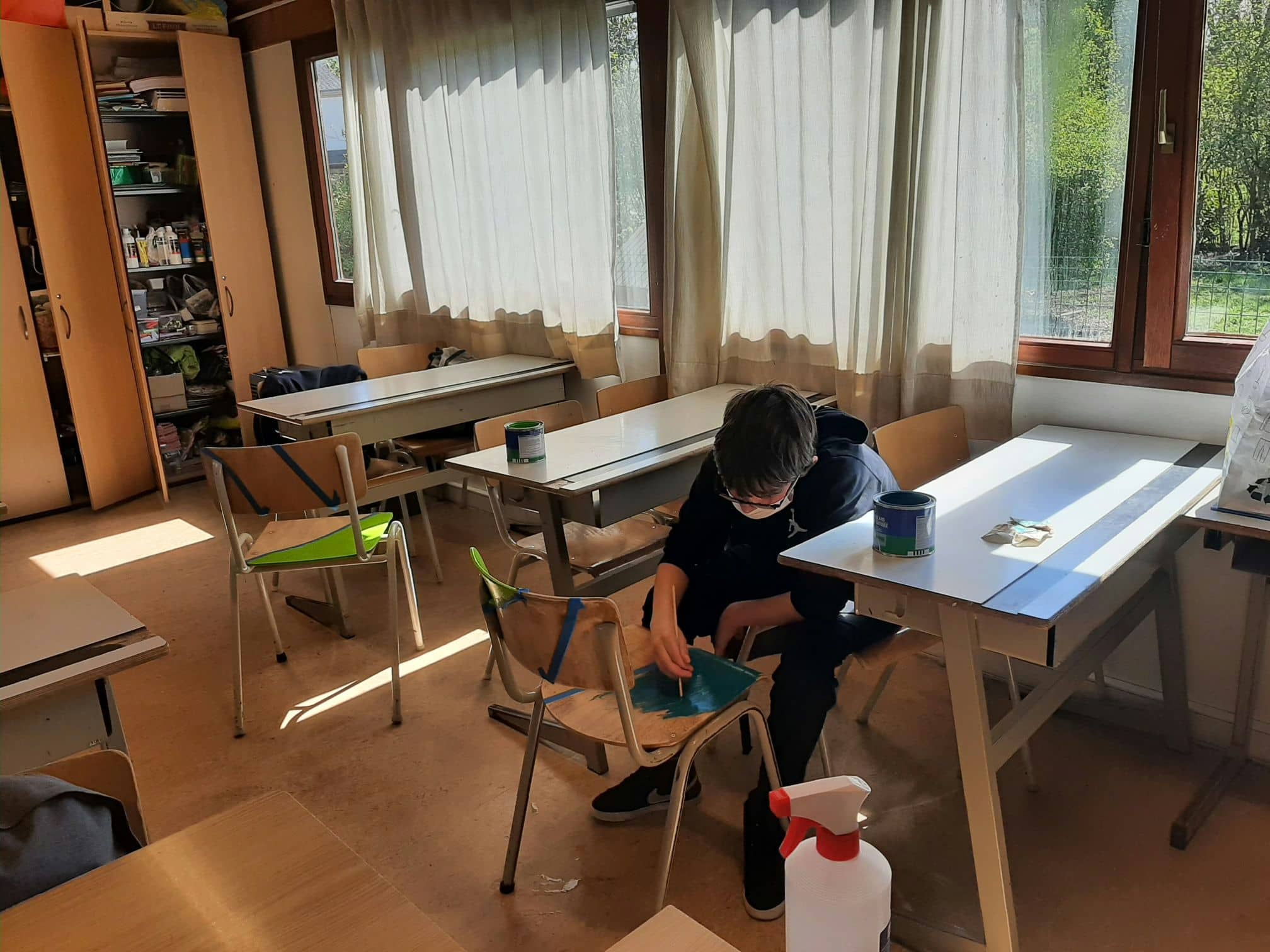 Mme Rausch, enseignante en éducation plastique, rénove toutes les vieilles chaises de l’école avec ses élèves de 2ème différenciée.